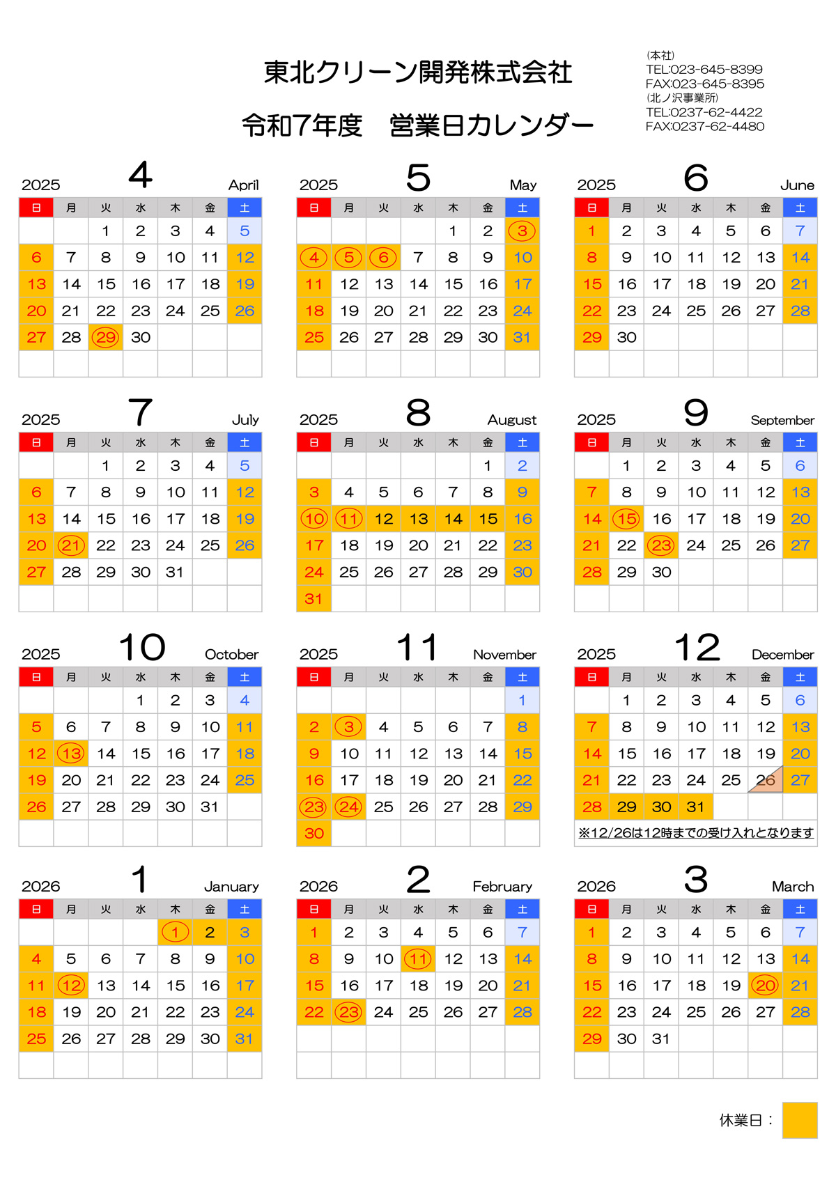 営業日カレンダー